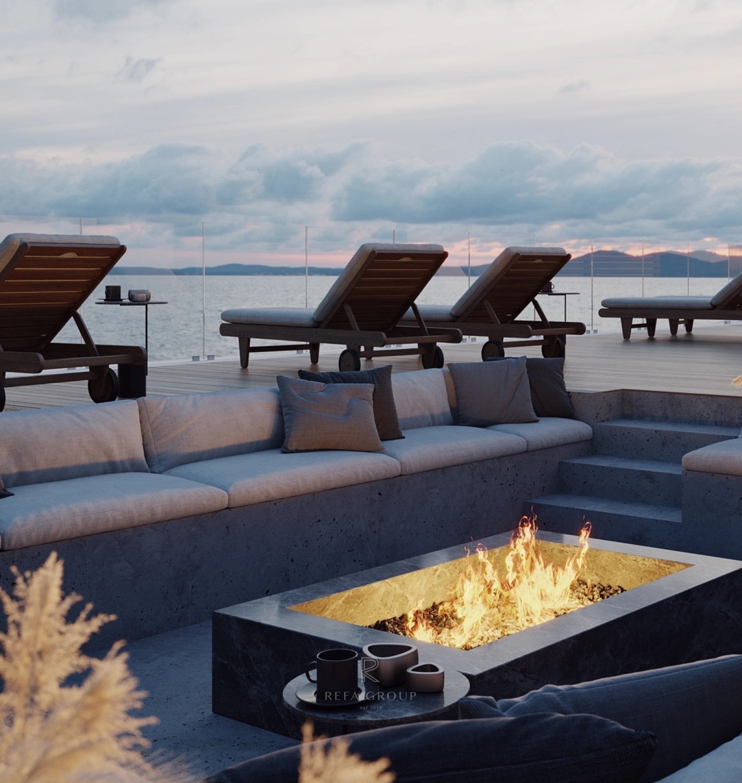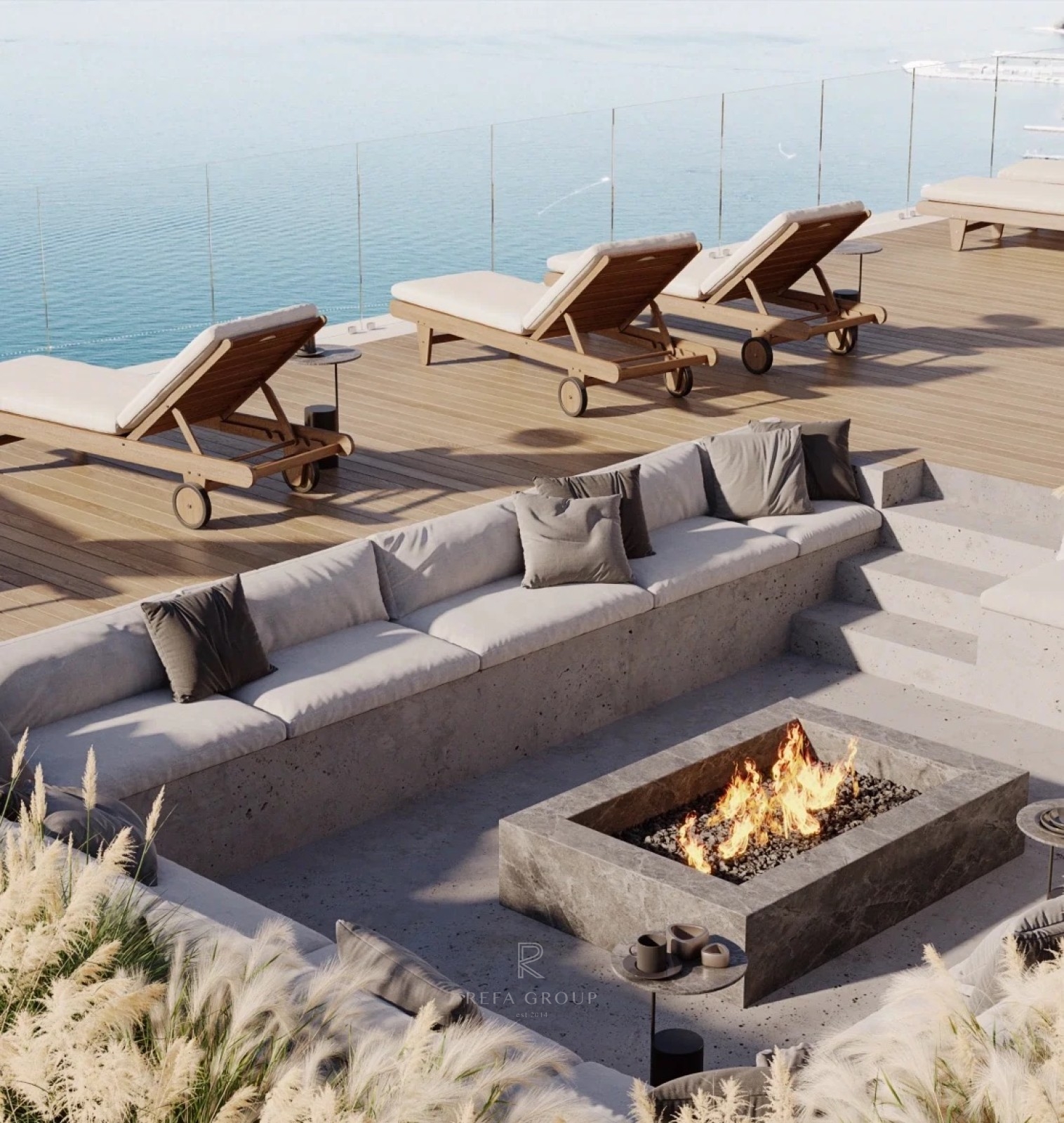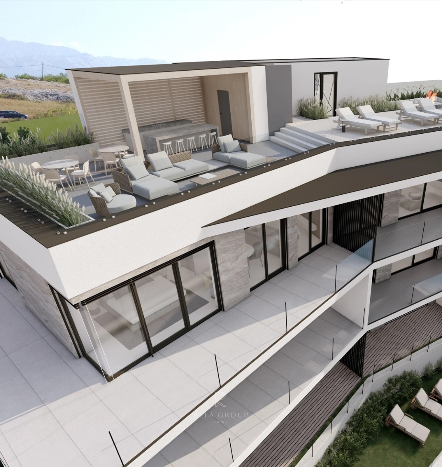 Soukromá terasa o výměře 42 m2 obklopuje celý apartmán a skýtá příjemné posezení s úchvatnými výhledy na mořský záliv a nedaleký ostrov Pag. Ve společných prostorách nemovitosti můžete využít také plně vybavenou posilovnu a velkou společnou střešní terasu s posezením, barem a zapuštěným grilem. V horkých letních dnech oceníte blízkost pláže a také soukromý infinity bazén. Naopak během chladnějších měsíců přijde vhod finská sauna a vířivka.