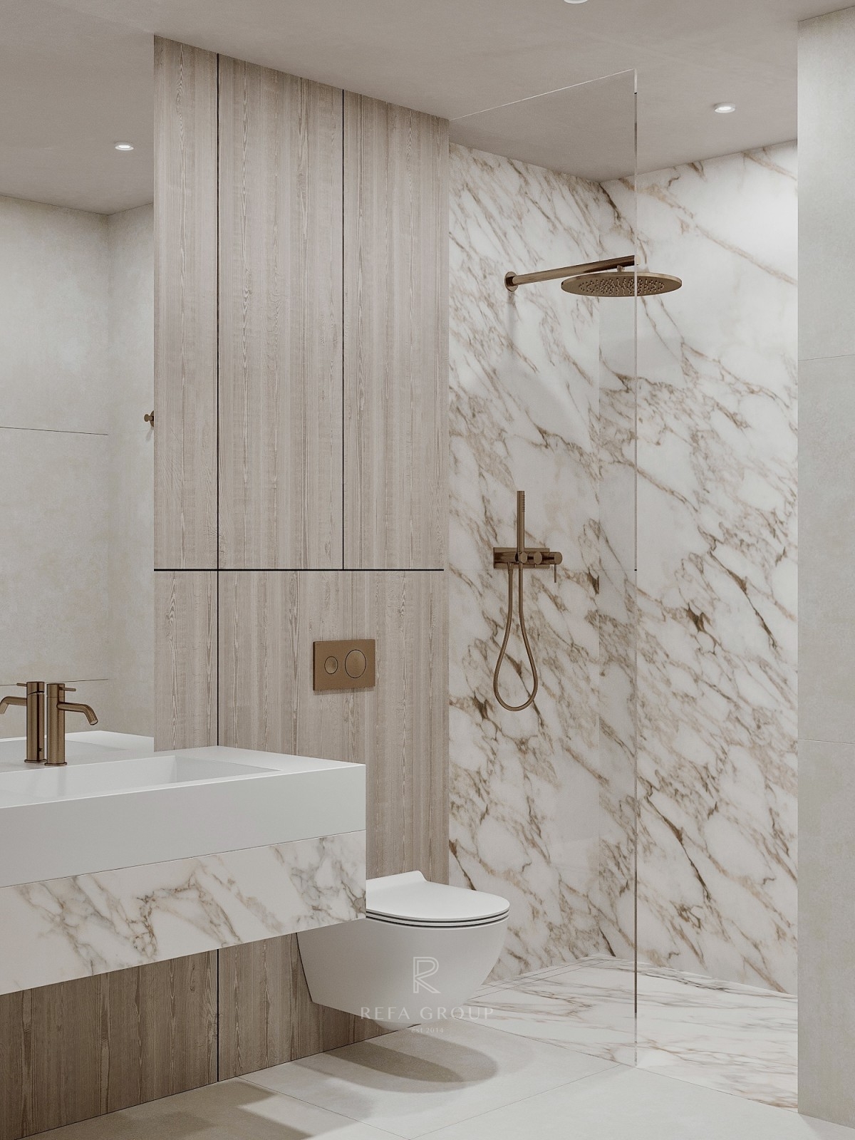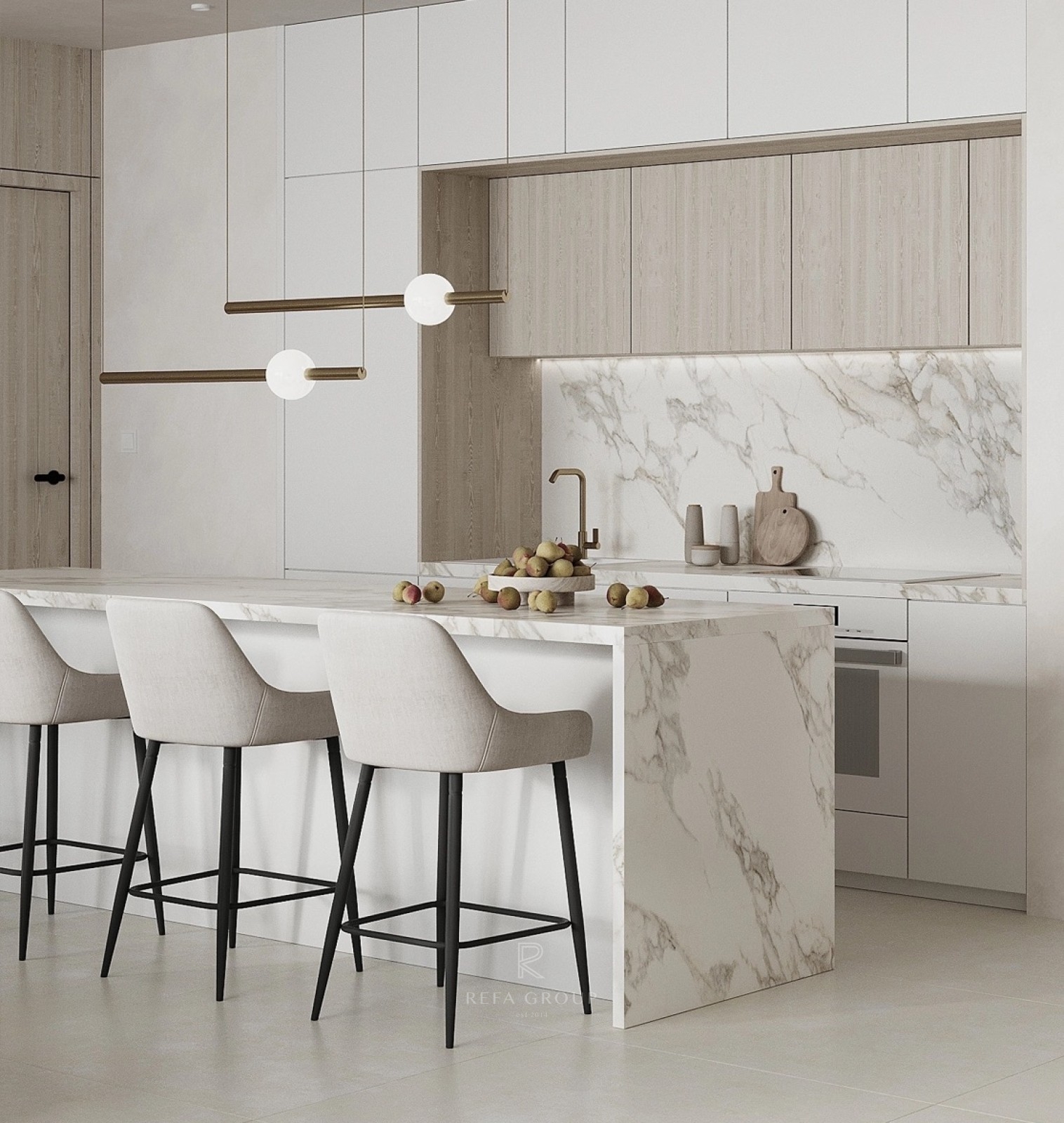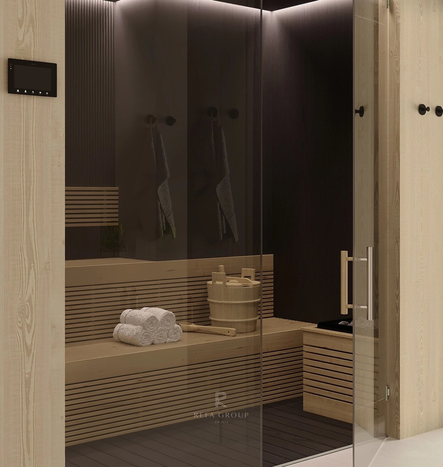 Interiér moderně zařízeného obývacího pokoje na první pohled zaujme kombinací dřevěných podlah a obkladů ze světlého mramoru. Obývací prostor je doplněn velkým jídelním stolem a elegantním kuchyňským ostrůvkem. Rohové ložnici vévodí pohodlná manželská postel spolu s privátní walk-in šatnou. Prostorný pokoj pro hosty pak nabízí další 2 lůžka.