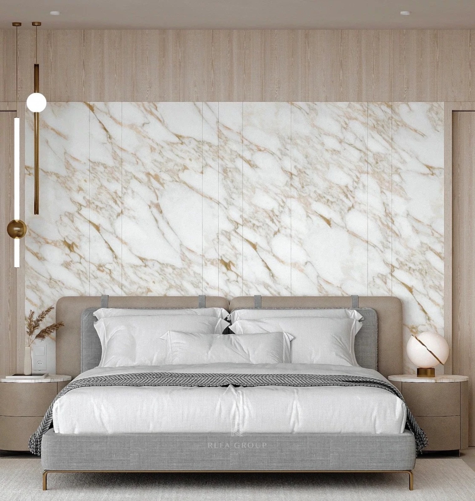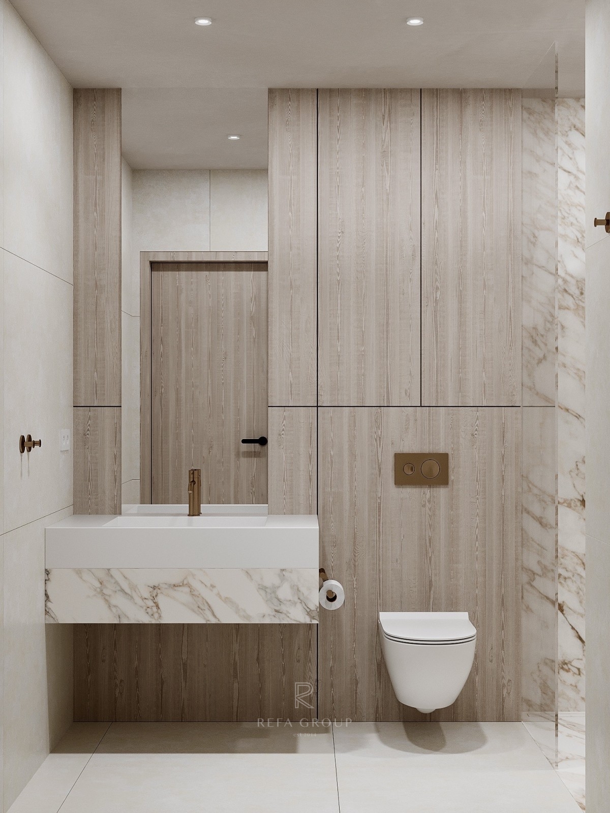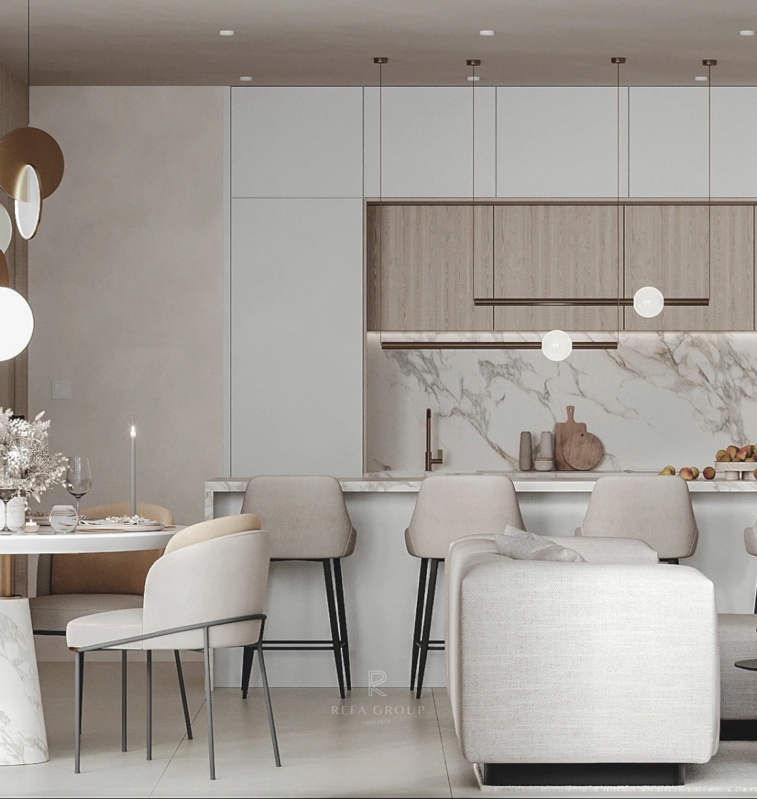 Interiér moderně zařízeného obývacího pokoje na první pohled zaujme kombinací dřevěných podlah a obkladů ze světlého mramoru. Obývací prostor je doplněn velkým jídelním stolem a elegantním kuchyňským ostrůvkem. Rohové ložnici vévodí pohodlná manželská postel spolu s privátní walk-in šatnou. Prostorný pokoj pro hosty pak nabízí další 2 lůžka.